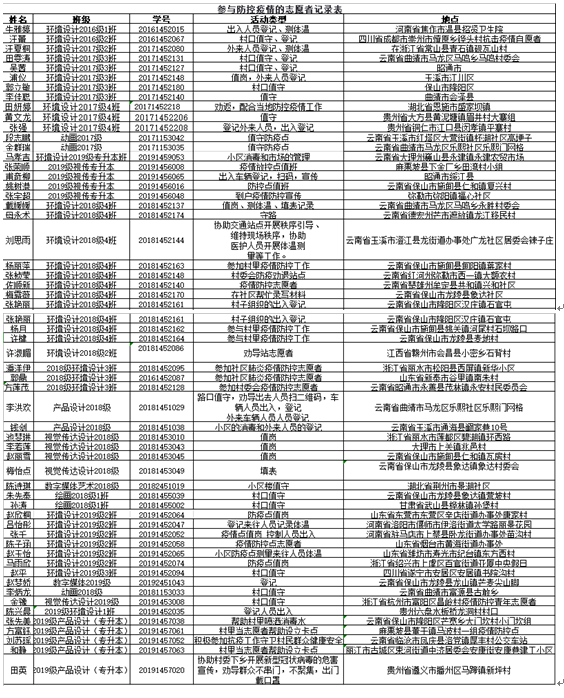2017级环境设计3班浦仪同学在新型冠状病毒防疫期间积极配合云南省玉溪市江川区大街镇河咀社区村委会进行为期11日的防疫工作,在防疫工作中进行了外来人员排查、为村民测量体温、对当地所住村民调查、值守重要交通路线、指导村民出入扫码等工作,用实际行动参与疫情防控,守卫村民的安全,坚守村寨0病例。
