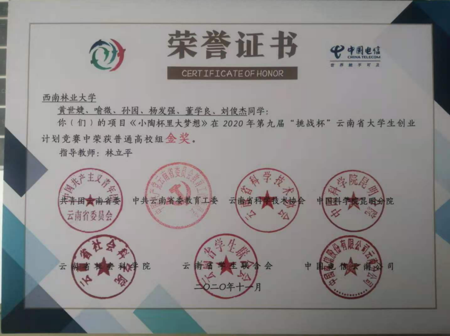 由共青团云南省委、省委教育工委、省科协、中科院昆明分院、省社科院、省学联、中国电信云南公司等部门共同主办的第九届“挑战杯”云南省老员工创业计划竞赛终审决赛在昆明举行。由林立平老师指导的“小陶杯里大梦想”项目获得普通高校组金奖。